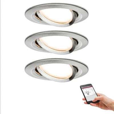 Practical set of 3: Nova-Plus LED recessed spotlight with app control The Nova Plus LED recessed spotlight is a round spotlight made of aluminium in brushed iron. It is supplied here in a practical set of 3. These can be used in a new as well as existing installation as a replacement for previous spots. The 230V direct connection is practical. Thanks to the integrated ZigBee technology, the Nova Plus recessed spotlight can be used with a suitable Smart Home system, such as Philips Hue. To do this, the spotlight must be connected to the corresponding gateway or bridge. Afterwards, it can be switched and dimmed continuously via the app, via voice assistant or also with a suitable remote control. Switching on and off via the conventional wall switch is still possible. Technical data/compatibility: - Controllable smartphone or tablet or with the Paulmann ZigBee remote control (see accessories). - Warm white - 2,700 K - Scope of delivery 3 pieces - mesh-capable - range increases from product to product - compatible with Amazon Alexa Echo Plus, Philips Hue Bridge 2 (except: Hue Entertainment), LEDVANCE SMART+