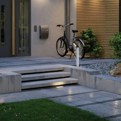 Sensor-controlled LED solar path light Soley in unusual shape If you are looking for a bollard lamp that combines functionality and independent design, Soley by Paulmann should be on the list. The sloping, funnel-shaped head on anthracite-coloured plastic is supported by two standing, angularly offset strips in aluminium finish. For anchoring, an earth spike which can be screwed to the luminaire is included in the delivery. The power supply is a 3.7 V 18650 rechargeable battery, which provides energy for up to 10 hours at night and is charged within 8 hours during the day via the solar module integrated on the head. The LEDs, which are divided into three burn points on the underside of the head, are activated in the dark by a twilight sensor as a discreet orientation light. A motion detector reacts to people at a distance of up to 2 m and switches Soley to full light output. A manual main switch is located under the head.