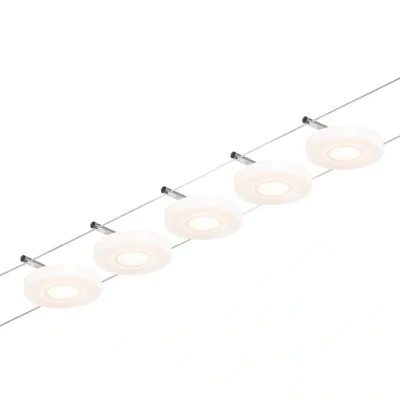 The Paulmann Wire DiscLED LED cable lighting system, with 5 bulbs, combines modern design with functional lighting. The combination of opal plastic and chrome-coloured accents gives the system a timeless elegance that blends seamlessly into various interior styles. The warm white light colour of 3,000 Kelvin creates a pleasant atmosphere that ensures well-being in hallways, living rooms and dining rooms alike.