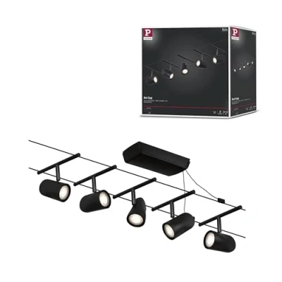 AmazonBasic Set Without Lightbulbs: The set consists of a transformer, cable, spotlights and assembly instructions (may not be in English) Practical: Wire cable systems are ideal for illuminating large and angled rooms Lightbulbs Freely Selectable: don't forget: Order the right lamp at the same time! Brand Manufacturer: Paulmann makes light with passion and has been doing so for 40 years Individual: Suitable for both wall and ceiling mounting