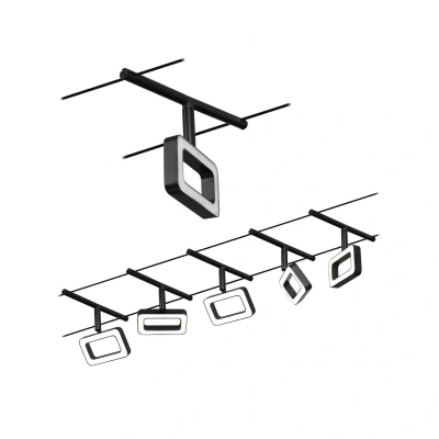 LED cable lighting system Frame as a complete set consisting of five lights, cable and transformer The Frame cable lighting system is supplied ready for connection as a complete set consisting of cable, transformer and five angular lights. The individual lights, which are designed as rectangular frames, can not only be positioned anywhere on the cable, but can also be rotated and swivelled so that the individual lights can shine in different directions. Das makes a cable lighting system the ideal light for long corridors or angled rooms. The Frame cable lighting system can be mounted on the ceiling, but also on a sloping roof or on the wall. It is fitted with energy-efficient, warm white LEDs, making it a contemporary and energy-saving light source for basic room lighting.