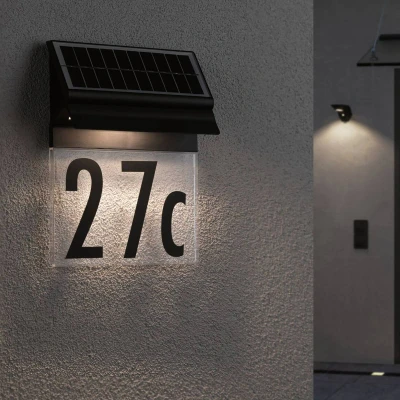 LED solar house number light Neda in black with IP44 Completely without a power connection comes the solar-powered LED house number light Neda and shows visitors, postal or parcel services the way. The light is supplied with a lettering set of numbers and letters, which are glued onto the transparent surface made of plastic. A flat solar panel on the top charges the battery during the day, so that when the battery is fully charged, the house number is illuminated by the warm white LEDs at nightfall. Switching on is done automatically by the integrated twilight sensor. The light is equipped with a switch on the side and lights up for up to 3 days (nights) when the battery is fully charged.
