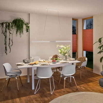 Lamp MastersAptare Pendant Light ZigBee/dimmable. White is a modern light with many customisation, adjustment and adaptation options for all needs and purposes. The light source consists of built-in LEDs that shine from light panels at the top and bottom of the long, slim light, creating a dual light that illuminates the area below the light and spreads upwards in a harmonious backlight. The pendant light is adjustable in both height and length, so you can decide for yourself how concentrated or diffused you want the light to be. The light comes with a remote control that allows you to control the light from a distance and adjust the brightness, for example. Top: The pendant light can also be connected to a Zigbee bridge for precise control of the light via smartphone or voice assistant. The light can also be integrated into an existing smart home system such as Philips Hue.