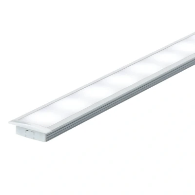 Floor recessed profile for MaxLED or YourLED LED strips This aluminium recessed profile with satin-finish plastic cover can be fitted with a MaxLED LED strip in any light colour and enables decorative and safe illumination of floors or furniture. The strip is simply glued into floor coverings from a thickness of 8 mm or milled into furniture from a material thickness of 1.2 cm. The profile can be shortened as required. Whether as a decorative edge or visual room divider - in combination with this recessed profile, the LED strips can be used for a wide range of applications - Profile can be shortened as required - Can be walked on up to max. 130 kg - Includes end caps and support surface - Compatible with YourLED and MaxLED strips