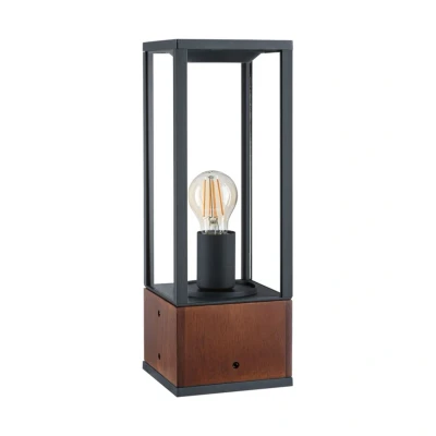 Lights.coSocket lamp Timba made of wood and metal with E27 socket In the form of a straight, modern lantern presents the socket lamp Timba. It owes its special charm to the combination of wood and black designed metal, which forms an angular lantern as an open cuboid of struts. In the lantern was installed an E27 socket, which can be equipped with a bulb of your choice. The light is emitted on all sides, so the base luminaire safely illuminates terraces or paths, at the same time, its stylish design makes it a beautiful decoration, even turned off