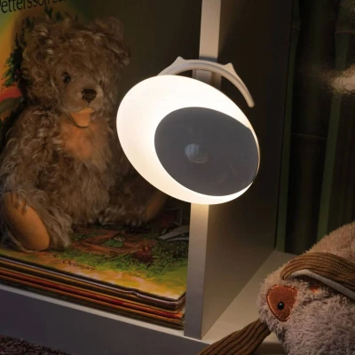 Mobile LED night light Viby with many functions in modern design The LED night light Viby is an optimal light dispenser for mobile use because it is battery operated. It can be set up, hung up or glued on and is activated by a motion detector or the twilight sensor. The night light with its warm white LED light source is the ideal companion through dark rooms. The light duration can be individually adjusted, as it can be activated via the twilight sensor or as a permanent night light to ensure safe walking. Detection range of the motion detector: