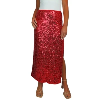 Paulo Due Women's Stretch Sequin Maxi Skirt Ladies Sparkly Elegant Fully Lined with Open Side Leg Slit Special Occasions Red 8 22 (16 18) L