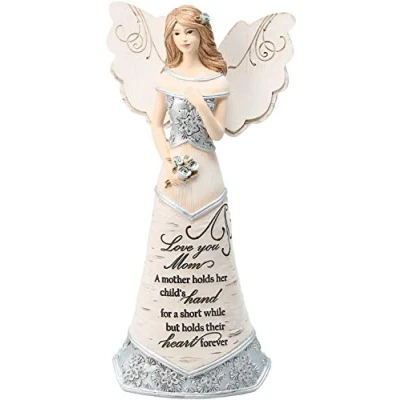 Reads: love you mom - a mother holds her child's hand for a short while but holds their heart forever 7.5 inch collectible angel is holding her hand over her heart and holding a bouquet of flowers Beautifully detailed high quality polyresin angel figurine Intricate silver floral design and birch tree textured resin Comes in beautiful gift ready packaging - great for gifting to mom for mother's day