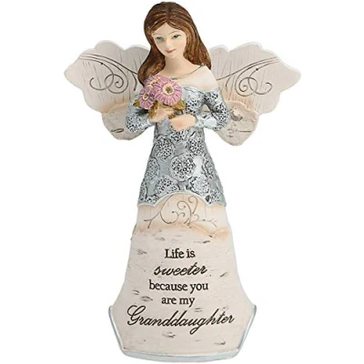 PREMIUM QUALITY: 5.5" angel figurine, packaged in a printed box, is made from polyresin. IN-HOUSE DESIGN: "Life Is Sweeter Because You Are My Granddaughter" text is debossed and painted onto the front of the angel, alongside an intricate silver design and flowers. PERFECT FOR GIFTING: Perfect for gifting to a granddaughter. CARE INSTRUCTIONS: Dust with a dry cloth. MORE PRODUCTS: Angels with other sentiments are also available.
