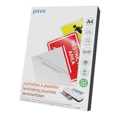 HIGH QUALITY: Laminating pouches give you a professional glossy finish to make your project stand out. A4 LARGE PACK: Giving you greater value for money, perfect for busy offices and handling of a high volume of projects (100 pieces) GREAT RIGIDITY: 250 Microns FAST and GLOSSY (2x125 Microns) is the ideal rigidity for everyday use, giving your documents a long-lasting protection EASY TO USE: Our premium quality laminating pouches are easy to use in any hot laminating machine. They also come with rounded corners and a sealed end to align your sheet within the pouch to facilitate a perfect finish PROTECTION: Pavo offers great protection and durability across its full range