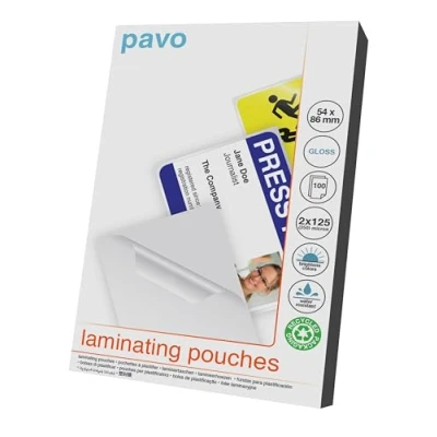 HIGH QUALITY: Laminating pouches give you a professional glossy finish to make your project stand out. Size 54x86mm LARGE PACK: Giving you greater value for money, perfect for busy offices and handling of a high volume of projects (100pieces) GREAT RIGIDITY: 250 Microns GLOSSY (2x125 Microns) is the ideal rigidity for everyday use, giving your documents a long-lasting protection EASY TO USE: Our premium quality laminating pouches are easy to use in any hot laminating machine. They also come with rounded corners and a sealed end to align your sheet within the pouch to facilitate a perfect finish PROTECTION: Pavo offers great protection and durability across its full range