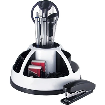 The Premium Rotating desk organiser set offers everything you need to keep your desk neat and organized. Including: 1x scissors, 1 x ruler, 1 x stapler, 1 box of staples, 1 x eraser,1 bag of paper clips (40pcs), 1 x mechanical pencil, 1 x retractable ball pen, 1 x box cutter Multi-function Desk Organiser: There are few small and bigger compartment organizer, so that you can organize your pens, scissors, TV remote, utensils, paintbrushes, etc. Keep your desk clear Elegant and Durable:It is no need to assemble and easy to clean, just wipe quickly with warm water and a damp cloth A great choice for gifts.Suitable for office and school classrooms,etc.Whether giving it to your family member or friend, our desktop organizer makes a great gift Color: White/ Black