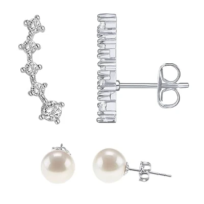 PAVOI Rhodium Plated Sterling Silver Post Climber Arrow Ear Crawler Pearl Earrings Set