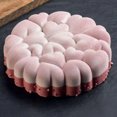 1 single-cavity mold that forms connected hearts whose imprint is stamped on the top and the sides of the food product; dimensions 7.05 inch by 7.01 inch by 1.89 inch high (179 millimeters by 178 millimeters by 48 millimeters high), with volume 34.56 ounce (1022 milliliters) Non-stick mold made of 100-percent platinum-cure black silicone (no fiberglass), the highest quality silicone that ensures the product is physiologically inert, odorless and flavorless, * its suitability for food safety; glossy interior ensures easy unmolding and minimal cleaning; mold is flexible for pushing baked food out of the mold or peeling the mold off frozen food Suited for sweet and savory foods: use the mold to bring your portioned-out food -- whether frozen in your freezer into ice cream or cooled in your refrigerator into jello or aspic or baked in the heat of your oven into bread or cake -- to its finished "Eros" form Resistant to stretching, resistant to tearing, resistant to extremes in temperature: down to -40 degrees Fahrenheit (-40 degrees Celsius) in freezer, up to 482 degrees Fahrenheit (250 degrees Celsius) in oven; safe in microwave, safe in dishwasher Before using it for the first time, wash this mold in the dishwasher; do not use caustic cleaners or rinse aids; before placing it in the oven for the first time, grease the mold, Manufacturer: Pavoni