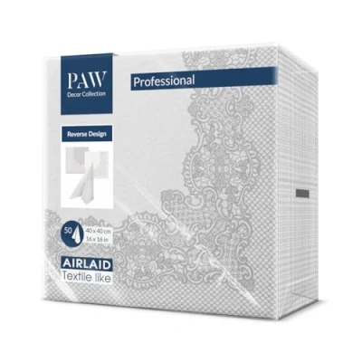 Paw Airlaid Napkins Fabric Like (40 x 40 cm) I Pack of 50 Ideal for Wedding, Christening, Communion, Birthday Table Decoration Back Pattern White/Silver Reverse Royal Lace Silver White