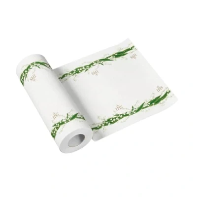 Premium Airlaid Table Runner 55gsm FSC Certified Made in Europe Dimensions: 40 x 2400 cm; perforated every 120 cm The product is certified by the National Institute of Public Health and proves that our products can come into contact with food and are environmentally friendly. "Compared to tissue paper, Airlaid is much stronger, more porous and softer. Its main features are: softness, does not scratch the surface, has a fabric structure, high moisture absorption." White Flowers is a unique pattern in which delicate leaves are interwoven into an intricate composition, creating an atmosphere of peace and celebration. It symbolizes the harmony of nature and spirit during the celebration of First Communion. It is a subtle and symbolic expression of an important stage in life and adds elegance to any First Communion reception.