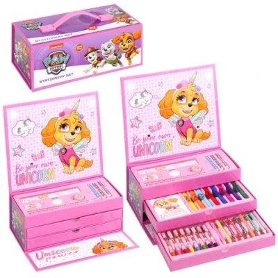 KID FRIENDLY DESIGN: This Paw Patrol Art Set is ideal for kids to carry to school, use at home or while travelling. Thanks to its stricking designs, based on some of the most emblematic movie and TV characters, kids will love using it every day. CONTENTS: This Art Set comes with 10 Sheet Colouring Notepad, 8 Water Based Colouring Fibre Pens, 11 Colouring Pencils, 8 Crayons, 2 HB Pencils, 1 Eraser, 1 Ruler and 1 Sharpener all packed nicely in a box. STURDY DESIGN: The Art Set comes in a nice colourful drawer packaging box set that can each come out for ease of use. OFFICIAL LICENSED: This is a 100% official licensed product. The kids will love the colouring set and carry them everywhere. Great for gift giving. BOX DIMENSIONS: 26.5 cm (length), 14 cm (width), 9.5 cm (height).