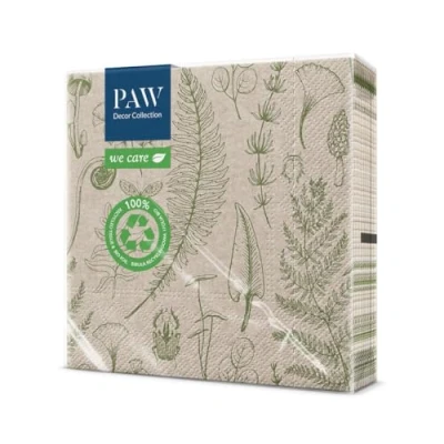 Napkins made from 3 ply brown recycled tissue paper, 17 g/m², FSC and Ecolabel certified, made in Europe Dimensions: 33 x 33 cm, pack of 20. The product is certified by the National Institute of Public Health and confirms that our products can come into contact with food, are environmentally friendly and meet the requirements of BFR XXXVI. The napkins are printed with water-based, environmentally friendly inks. The ECO - WE CARE collection includes napkins made from biodegradable tissue paper. With a sense of responsibility and an environmentally conscious lifestyle, we have created a collection of environmentally friendly products. All the raw materials we care napkins are made from are renewable and biodegradable. The entire product concept is complemented by a design that combines the beauty of nature and the current trend.