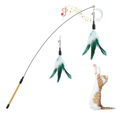 The natural feather flying motion at the tip of the wand activate a cat's natural instinct to chase and pounce, encouraging healthy activity. Long reach flexible wire(34.5 inch) aids play in a wider area to increase exercise and stimulation to your cat. Colorful nuatural feather and small bell on the tip draw your cat's attention easily and arouse its curiosity. Just gently flick the flexible dangler and enjoy the time with your cat. This flying feather cat catcher toy is really cute, lightweight, durable and funny. Use a safe, cat-friendly and non-toxic natural feathers to entice your cat into playing. A good interactive toy to strengthen the relationships between you and your cat. Please supervise your cat while playing at all times. A nice gift for cat lovers and cats.