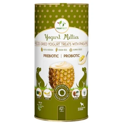 100% Natural Freeze-dried yogurt treats for dogs with prebiotics and probiotics Supports existing gut bacteria and delivers additional living cultures to pooches gut Low calorie (4 calories per treat only) Human Grade Grain, Gluten & Preservative Free