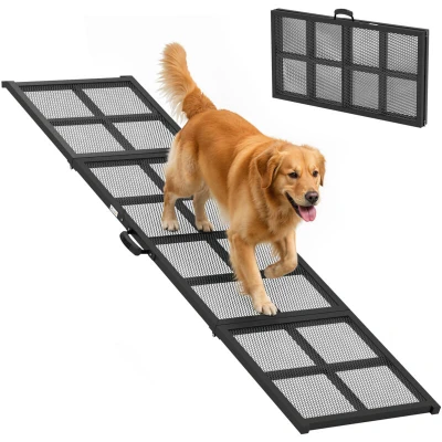 Does watching your dog struggle with high jumps cause you worry? The fear of joint strain can limit your shared adventures, turning simple car rides into stressful events. The PawHut dog car ramp offers a gentle, extra-long slope to ease their climb. Its wide, robust steel frame provides a stable, shake-free walkway, giving even timid pets the confidence to join you on every journey, restoring your peace of mind. Specifications: ● Colour: Black ● Material: Steel Tube, Steel Wire ● Overall Dimension: 191L x 50W x 4H cm ● Folding Size: 95.5L x 50W x 7H cm ● Slot Size: 15W x 50L mm ● Suitable Pet Weight: 60 kg ● Item Label: D06-278V00BK Features: ● Features a 191 cm length for a low-angle slope, reducing joint stress ● Its extra-wide 50 cm surface gives nervous dogs confidence and secure footing ● Heavy-duty steel frame supports up to 60 kg for rock-solid stability ● Diamond steel mesh provides paw grip, preventing slips in any weather ● Folds in half for compact storage and includes a