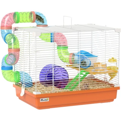 Pawhut 2 Tier Hamster Cage, Gerbil Cage with Handle, Exercise Wheels, Tunnel, Water Bottle, Dishes, Ladder, for Dwarf Hamster, Orange