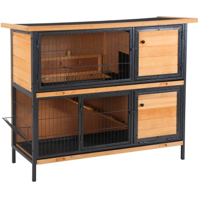 General description Give your pets a comfortable spot to relax with the PawHut Rabbit Hutch. This two-tier hutch provides ample space for up to four rabbits, featuring a cozy indoor area and a spacious front section for your pets to rest and stretch out comfortably. An internal ramp allows for quick access between the two floors, while lockable doors facilitate easy cleaning and routine tasks. Technical specifications Color: Light Yellow, Black Material: Fir Wood, Metal Overall Dimension: 122L x 50W x 101H cm Living House Dimension: 112L x 42W x 43H cm Wood Door Size: 37W x 37H cm Metal Door Size: 66W x 37H cm Ramp Size: 76L x 13.6W cm Tray Size: 107.5L x 40.5W cm Other information High-quality fir wood and metal frame with elevated living room, run backyard, ramp, and door Anti-UV and weather-resistant asphalt roof protects pets from harsh weather Raised perch keeps small animals safe, dry, and warm, especially in rainy conditions Non-slip ramp for easy movement between outdoor run