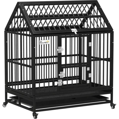 PawHut 43" Heavy Duty Dog Crate, Indoor Outdoor Cage on Wheels with Locks, Removable Tray, Openable Top, 2 Doors, for Large and Extra Breeds Black