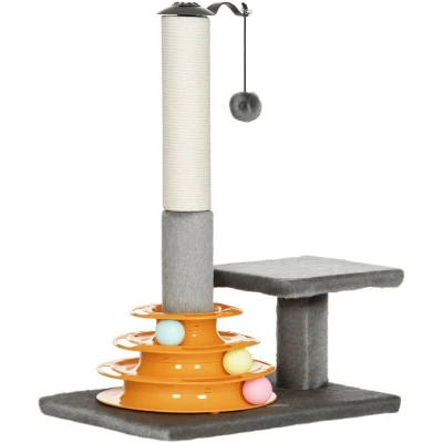 AmazonInteractive toys: On the base, there are balls on different layers, which cats can hit and chase around in circles. At the top, there's a hanging toy ball to play with. Sisal scratching post: Pets can dig their claws into this cat tree, deterring them from using furniture. Solid material: Made of durable particle board, this cat play tower has a solid base for extra stability. It'll stay sturdy and upright when pets are using. Comfortable features: Covered in soft plush fabric, pets will rest on the raised platform – a cosy cat tower for a good night's rest. The toy can be removed, so they have extra space. Dimensions: 56H x 40L x 31Wcm. Maximum load 4kg. Assembly required.