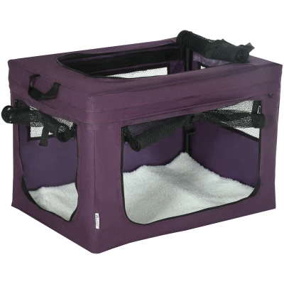 General description Traveling with your pets has never been easier with the PawHut Foldable Pet Carrier. This portable pet travel bag is designed for medium dogs, providing a spacious and comfortable environment for your furry friend. With its convenient design, you can easily carry it using the two handles on top. The carrier features three doors for easy access, allowing your pet to enter a cozy area where they can relax on a soft cushion while enjoying airflow through the mesh window. Technical specifications Colour: Purple and black Material: Oxford cloth, steel, and polyester Overall Dimensions: 60L x 42W x 42H cm Storage Dimensions: 80L x 11W x 11H cm Door Dimensions: 44L x 27W cm (front), 28L x 28W cm (left), 44L x 27W cm (top) Cushion Dimensions: 55L x 37W cm Suitable for miniature dogs less than 40 cm in length and 4 kg in weight Item label: D00-152V01VT Compatibility and accessories Includes a storage bag for easy transport Installation Assembly required Usage Can be used