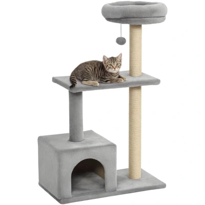 PawHut 96cm Cat Tree Condo Sisal Scratching Post Tower Kitten Play House Dangling Ball Activity Center Furniture Grey