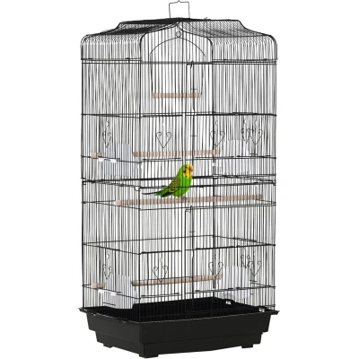 General description A spacious PawHut bird cage designed to provide an entertaining and comfortable home for birds. It features three wooden perches, four plastic food containers, and a swing, ensuring a lively environment for your feathered friends. The cage is equipped with two large front doors for easy access and ten small doors for feeding, cleaning, and interaction. The slide-out tray at the bottom simplifies cleaning, keeping the space tidy and comfortable for eating, playing, and relaxing. Technical specifications Material: Metal wire, wood, and PS Colour: Black Overall dimensions: 92H x 46.5L x 35.5W cm Bottom tray dimensions: 10H x 46.5L x 35.5W cm Large door dimensions: 30L x 31W cm Small door dimensions: 11W x 11.5W cm and 8.5W x 11.5W cm Food bowl dimensions: 9H x 8L x 6W cm Perch dimensions: Φ1.1 x 46L cm Swing dimensions: 17H x 15W cm Bar spacing: 0.9 cm Net weight: 4.5 kg Other information Spacious design made from powder-coated metal for stability Assembly required