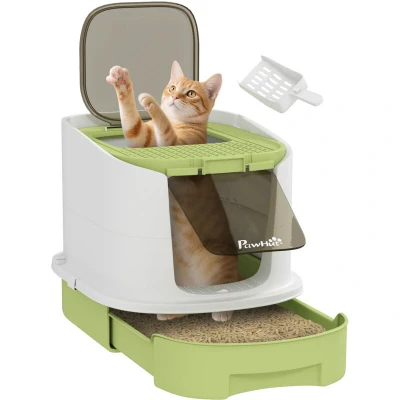 PawHut Cat Litter Box, Hooded Tray with Lid, Scoop, Green