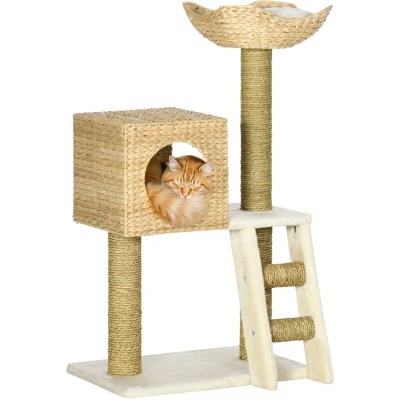PawHut Cat Tree for Indoor Cats Kitten Tower Cattail Weave with Scratching Posts, House, Bed, Ladder, Washable Cushions Natural Finish