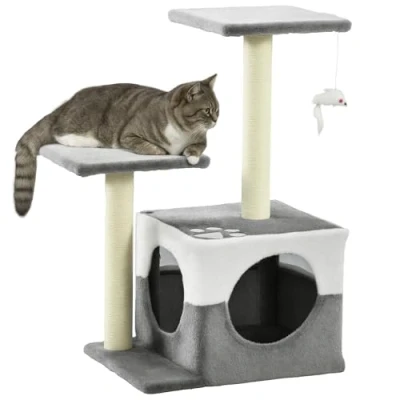 PawHut Cat Tree Tower for Indoor Cats Kitten House Scratching Posts with Condo Perch Interactive Mouse Toy, 45 x 33 70 cm, Grey