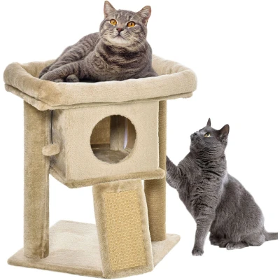 General description With this PawHut small cat tower, your pet's daily life won't be the same. If they want to scratch, climb, and play, they can happily do so, thanks to the multiple levels, jute scratching pad, and toy ball, which will stop them from climbing and clawing at your furniture. When it's time to rest, they have two options – a top perch or a private cat house – both covered in soft plush fabric for extra snugness. With this cat tree tower, every day is comfortable. Technical specifications Colour: Coffee Material: Particle board, plush, and jute Dimensions: 57H x 40L x 40W cm Cat house dimensions: 23H x 30L x 30W cm Door hole: Ф15 cm Scratching pad dimensions: 14H x 27L cm Bottom plate dimensions: 40L x 40W cm Top cat bed dimensions: 6H x 48L x 30W cm Pole diameter: Ф5.5 cm Recommended pet weight: under 5 kg Maximum load: 5 kg Assembly required Usage Wide perch provides a comfortable space for cats to relax Jute scratching pad included, so cats can sharpen their claws,