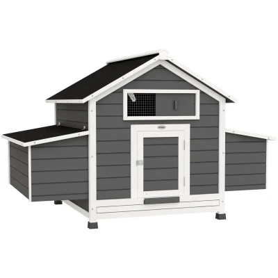 Give your chickens a cosy and inviting home with the PawHut chicken coop, where they can feel secure and relaxed. With comfy perches and charming nesting boxes that make egg collection effortless, they can enjoy plenty of space to roam and rest. The wide front doorlet you easily care for your feathered friends, while removable trays keep their space fresh. A great haven for happy, healthy chickens all year round. Specifications: ● Colour: Grey ● Material: Fir wood ● Overall dimension: 150L x 100W x 96.5H cm ● Front window: 45.4L x 16.5W cm ● Front door: 28L x 36W cm ● Nesting box: 81L x 32D x 35H cm ● Tray size: 72.5L x 84.3W x 3T cm ● Suitable number: 2-4 chickens ● Item label: D51-065V01GY Features: ● Two nesting boxes with top openings simplify egg collection easily ● Spacious inner with perches for chickens rest and roam comfortably ● The large front door allows chickens easy entry and exit ● Ventilated windows provide fresh air for healthy, happy chickens ● Removable trays and