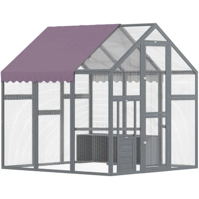 General description This spacious PawHut Large Walk In Chicken Run transforms your garden into a poultry paradise, providing a secure and comfortable environment for 6-8 chickens. With its small mesh grid and large living area, it ensures your feathery friends thrive. The run features two nesting boxes and roosting bars, while the waterproof and UV-resistant cover keeps them cozy and dry throughout the year. Technical specifications Colour: Purple, Grey Material: Fir Wood Overall Dimensions: 168W x 183D x 182H cm Nesting Box Dimensions: 58L x 30W x 39H cm Nesting Box Door Dimensions: 25W x 36H cm Top Cover Dimensions: 229L x 122W cm Front Door Dimensions: 46W x 86H cm (Upper), 46W x 65H cm (Lower) Small Door Dimensions: 22W x 33H cm Mesh Grid Size: 1.2L x 1.2W cm Living Area: 3.07㎡ Installation Two-person assembly achievable within 100 minutes for easy setup. Usage Accommodates 6-8 poultries, making it suitable for flocks. Split front door design facilitates feeding without full