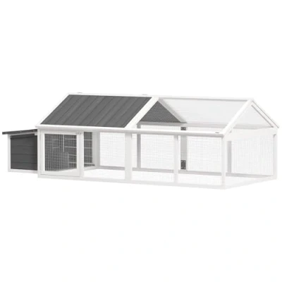 General description This PawHut Wooden Chicken Run is a safe and comfortable home for small pets, accommodating up to eight animals. The wire mesh surrounding the coop ensures their safety while allowing them to roam freely. It features a large door and an openable roof for easy feeding and cleaning, making it a versatile option that can be attached to another animal coop for additional space. Technical specifications Colour: White Material: Fir wood and wire mesh Overall dimensions: 76H x 240L x 112.5W cm Eave height: 49 cm Nesting box dimensions: 43H x 37.5L x 93W cm Door dimensions: 43H x 44W cm Item label: D51-360V00WT Compatibility and accessories Can be used with another animal coop of size 45H x 90L x 90W cm or smaller Nesting box included for keeping eggs Installation Assembly required