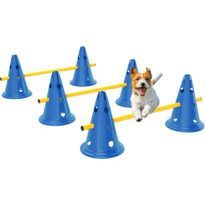 Train your dog with the PawHut pet agility set! Featuring three adjustable dog jumps to suit any size or skill level, this dog training equipment enhances concentration, fitness and agility. Made from safe, lightweight ABS, it's simple to assemble and disassemble and comes with a bag for easy transport. Whether in your garden or at the local park, you'll not only train your dog but also strengthen your bond! Specifications: ● Colour: Blue and yellow ● Material: ABS and PE ● Each size: 30H x 80W x 22.5Dcm ● Crossbar: 40Lcm ● Adjustable height: 20.5H x 6, 13.5cm ● Straight pipe: Ф25 x 1.9Dcm ● Item label: D07-059V00BU Features: ● Three-piece set includes six cones, six poles and a storage bag ● Boosts concentration, fitness and coordination ● Three adjustable heights for different pet sizes ● Easy to disassemble poles and cones for easy transport ● Bag included for simple storage ● Safe ABS material ensures lightweight, impact-resistant use ● Easy-to-clean kit maintains hygiene ●