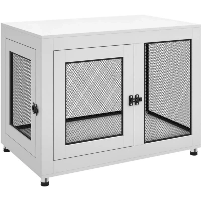 General description A PawHut dog cage that benefits both pets and owners – providing a safe and comfortable space for pets to relax while offering a stylish tabletop for displaying your favorite items. Pets can enter through the front or side door and enjoy a soft, washable cushion inside, with steel wire allowing airflow to keep them cool. The lockable doors ensure their security. Technical specifications Colour: White and black Material: Steel, particle board, plush, and spray adhesive cotton (100% polypropylene) Overall dimensions: 71.5H x 94W x 60D cm Inside cage dimensions: 63H x 90W x 57D cm Single door dimensions: 50.5H x 44W cm Cushion dimensions: 90L x 56W x 5D cm Leg height from the ground: 4 cm Side mesh grid dimensions: 13L x 8W mm Suitable for large dogs up to 30 kg and 60 cm in body length Installation Assembly required Usage Can be used as a nightstand or side table, as well as a dog crate Display your favorite pieces on the spacious tabletop Front and side doors