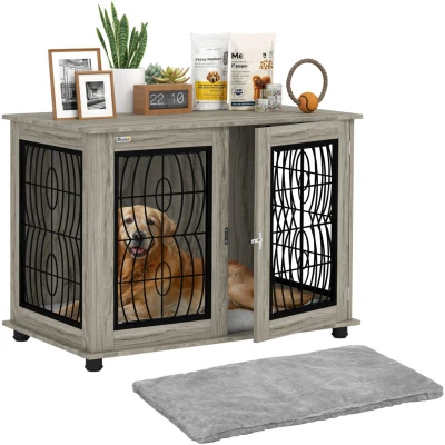 Crafted with a grey wood effect finish, this dog cage doubles as an elegant side table, making it an attractive addition to your interior décor. The versatile tabletop is ideal for displaying plants, lamps, or cherished items, all while keeping your pet snug and secure inside.