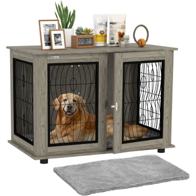 PawHut Dog Crate Furniture, End Table with Large Top, Indoor Pet Soft Washable Cushion, Lockable Front Door, Wire Mesh Ventilation, for Extra Dogs, Grey Wood Effect, 118 x 75 82cm