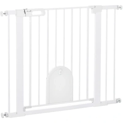 PawHut Dog Gate with Cat Flap Pet Safety Barrier, Stair Pressure Fit, Auto Close, Double Locking, for Doorways, Hallways, 75 103 cm White