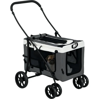 General description For pet owners always on the move, this PawHut pet stroller is the perfect solution. Comfortable and functional, pets will lounge in a soft-padded cart, enjoying the cool breeze flowing through the mesh window. The compartment can be removed to use it as a carrier, and its folding frame ensures effortless storage and portability, making it easy to take anywhere. Prioritizing safety, the stroller features two safety leashes and dual rear brakes, putting your pet's well-being first and enhancing their outdoor experience. Technical specifications Colour: Grey, white and black Material: Oxford fabric, steel and EVA Dimensions: 97.5H x 81L x 58W cm Main body: 39H x 60L x 37W cm Folded frame: 27H x 78L x 58W cm Folded carrier: 12H x 39L x 37W cm Adjustable safety leash length: 26-51 cm Pouch: 20H x 22W cm Padding: 59L x 35W x 2.5D cm Carry strap length: 60-118 cm Front wheel: Φ6 Rear wheel: Φ8 Item label: D00-192V00GY Compatibility and accessories Suitable for miniature