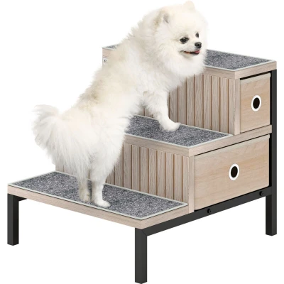 General description The PawHut pet stairs are designed to help pets easily reach their favorite spots with gentle, accessible steps. These stairs provide a smooth climb for older cats and small dogs, while hidden storage keeps toys, treats, and essentials organized and close by. Each step features a removable, washable anti-slip mat for a clean and secure path for your little companions. Technical specifications Colour: Oak tone and black Material: Particle board, steel, and carpet fabric Overall dimensions: 39H x 40W x 46D cm Each step dimensions: 40W x 15D cm Step heights: 13 cm, 25 cm, 39 cm Lower drawer dimensions: 11H x 40W x 27D cm Upper drawer dimensions: 11H x 40W x 11.5D cm Each carpet mat dimensions: 40L x 15.5W cm Recommended weight: ≤ 5 kg (Cat), 4-10 kg (Small Dog) Item label: D06-274V00AK Usage Designed for small or senior pets to reduce joint strain Supports pets up to 10 kg Includes removable, machine-washable carpets for easy cleaning Wide 40 cm steps provide ample