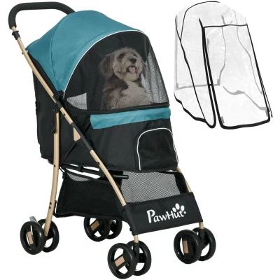 PawHut Dog Stroller with Rain Cover, Foldable Pram, 4 Wheels Pet Pushchair Safety Leashes, for Small, Miniature Dogs, Cats Dark Green