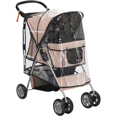 General description A PawHut pet stroller is an essential accessory for pet owners, especially for senior pets and those with mobility issues. This foldable and lightweight stroller allows you to take your furry friend on outings, regardless of the weather, thanks to its rain cover. It provides a comfortable and secure environment for your pet, enabling you to bond and enjoy quality time together. Technical specifications Colour: Brown Material: Steel, Oxford Cloth, PVC Overall Dimensions: 75L x 45W x 97H cm Inside Dimensions: 55L x 32W x 52H cm Cover Dimensions: 60L x 34W x 50-68H cm Folded Dimensions: 83L x 45W x 25H cm Rear Door Size: 33W x 40H cm Cup Holder Dimensions: Φ37 x 12H cm Storage Basket Size: 30L x 30W cm Wheel Size: Φ14.5 cm Suitable for small and miniature dogs less than 35 cm in length and less than 10 kg in weight Installation Assembly is required for this pet stroller. Usage This stroller is designed for taking small and miniature dogs on walks, providing a safe and