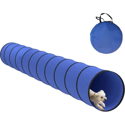 Struggling to find engaging activities for your energetic pup? Setting up bulky training gear is a hassle and flimsy equipment can spoil the fun and pose risks. This PawHut dog agility tunnel offers a solution. It pops up instantly, creating a generous 500cm runway for play. Included ground pegs ensure it stays firmly in place, even with the most enthusiastic dashes, providing a secure space for joyful bonding in your garden or at the park. Specifications: ● Colour: Blue, Black ● Material: Oxford Cloth ● Overall Dimension: 500L x 60W x 60H cm ● Folding Size: Φ60 x 6H cm ● Item Label: D07-069V01BU Features: ● Extended 500 cm length offers a spacious run for small to medium pets ● Pops up instantly and folds flat, suitable for travel with its carry bag ● Includes 6 ground stakes, ensuring stability for secure outdoor play ● Made from tear-resistant 190D Oxford cloth for long-lasting use ● Versatile design is suitable for both indoor and outdoor agility training fun ● Enhances your bond