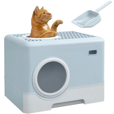 General description Presenting the PawHut cat litter box, revolutionizing your pet's litter routine. Spacious and enclosed, it provides comfort and privacy to ensure pets feel at ease. Cats enter through the front and exit above, minimizing litter spread around your home. The slide-out tray and scoop facilitate fuss-free maintenance. Sleek and compact, it blends seamlessly with your décor, creating a serene space for pets to use – no mess, no stress. Technical specifications Colour: Blue Material: PP Overall dimensions: 38.5H x 52L x 41W cm Inside space: 36.5H x 50L x 38.5W cm Front door: Φ18 cm Top door: Φ19 cm Tray dimensions: 47L x 37W x 11.5D cm Scoop dimensions: 21.5L x 9.8W x 3D cm Suitable for cats up to 4 kg Installation Assembly required Usage Convenient front entry and top exit for easy access The top has holes to contain mess inside the litter box A private space, making pets feel safe and secure